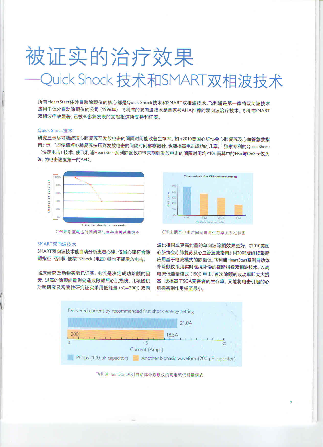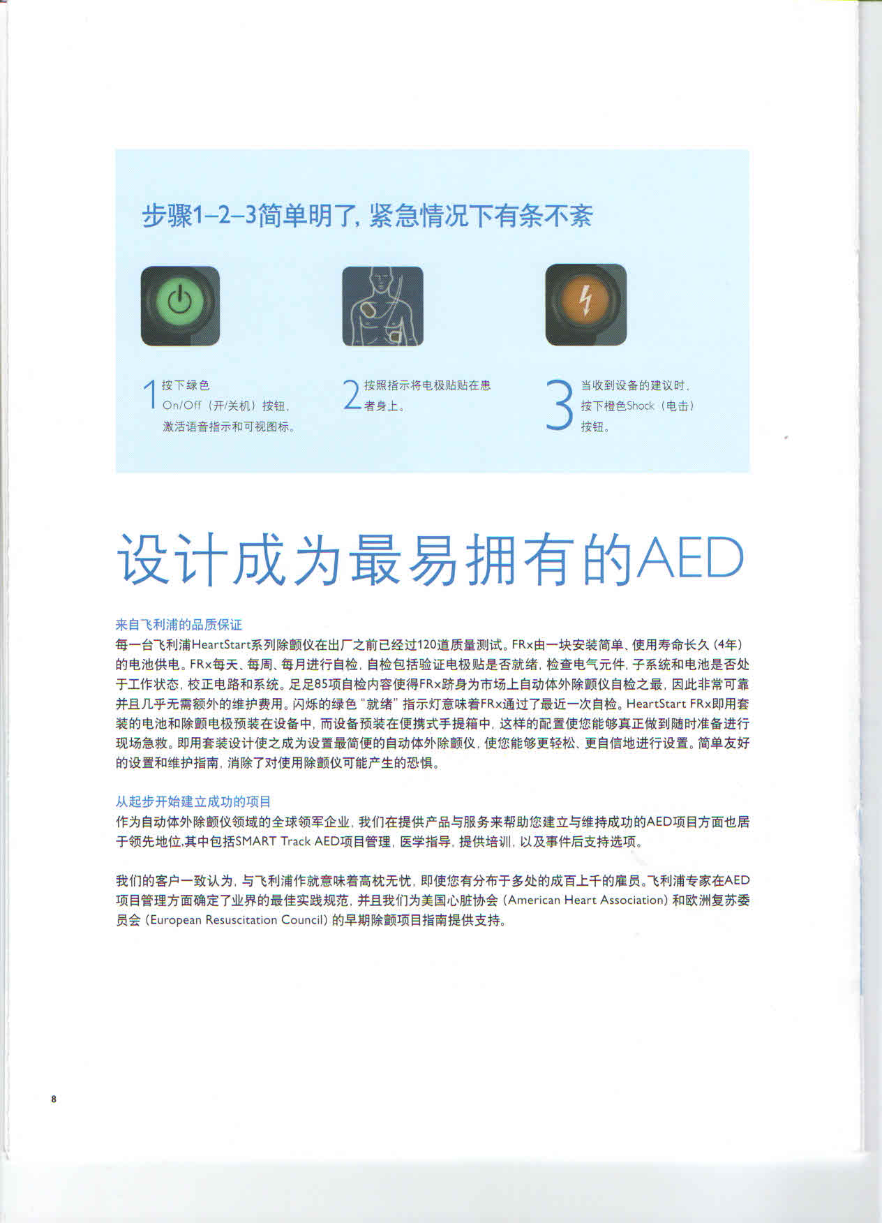 院前急救应用飞利浦自动体外除颤仪 (AED)优越先进性说明客服电话:刘经理:18612182679李经理:13718640850 自动体外除颤仪(AED)是一种小巧、轻便、由微型计算机控制的、智能化程度极高的体外除颤仪。不同于传统除颤仪要求使用人员需要在心电图识别和除颤仪操作上具有一定经验,AED能够自动分析心率并判断是否需要除颤,完善的语音提示能够指导临床经验较为薄弱的人员甚至非专业成功完成除颤
